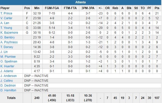 Autour d’Hardaway, 4 autres Knicks (devant de jusqu’à 28 points) ont signé au moins 15 points, dont le rookie Allonzo Trier. Son collègue Kevin Knox a terminé à 10 points à 4/16. Pour sa première NBA, Trae Young a lui signé 14 points à 5/14, 6 rebonds et 5 passes, alors que Taurean Prince a terminé meilleur marqueur des Hawks (24 ballons perdus) avec 21 points.