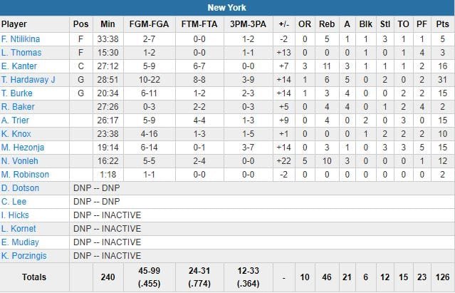 À noter : Hardaway est passé à 7 points du record de Patrick Ewing pour une opening night, mais il n’a pas eu besoin de jouer plus de 28 minutes. Le record de points de la franchise sur un quart-temps est de 53 (contre Seattle en 1967). Vince Carter, 41 ans, était titulaire et a joué 23 minutes pour 12 points à 4/9 et 2 rebonds.