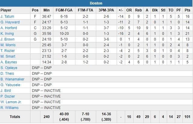 Les visiteurs, menés par Kyrie Irving (21 points à 10/20, 4 rebonds, 6 passes), Al Horford (14 points à 5/12, 10 rebonds, 9 passes), Jayson Tatum (16 points à 6/16 et 9 rebonds), Gordon Hayward (14 points à 6/13 et 7 rebonds en 24 minutes) et Jaylen Brown (13 points à 5/10) avaient pris les devants 25-18 au terme du 1er quart-temps mais ont ensuite encaissé un 95-76 sur les trois suivants.