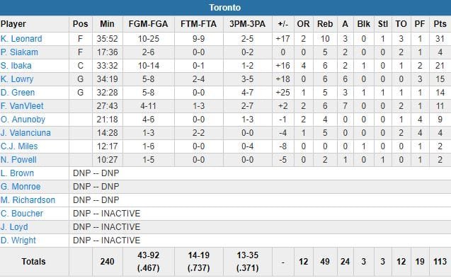 À noter : les Celtics ont fini à 7/10 aux lancers-francs, les Raptors (46 points à 34 dans la raquette) 14/19. Delon Wright (cuisse) n’a pas joué. Touché à l’œil contre Cleveland mercredi, OG Anunoby a porté des lunettes dans le 1er quart avant de les retirer pour le reste du match. Ibaka remplaçait Jonas Valanciunas (4 points et 5 rebonds en 14 minutes) dans le cinq majeur pour ce match.