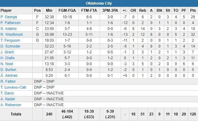 À noter : Shumpert a inscrit 16 points dans le 1er quart-temps, période durant laquelle les visiteurs ont shooté à 60%. Mavin Bagley III a terminé à 13 points à 5/13 et 7 rebonds en 23 minutes. George, Adams et Nerlens Noel ont chacun commis 3 fautes en première mi-temps. George a pris sa 5ème en fin de 3ème. OKC n’a shooté qu’à 19/30 aux lancers-francs. L’équipe a pris 104 shoots mais n’en a rentré que 44.2%. Westbrook et George ont shooté à 23/41, le reste de l’équipe 23/63 (5/16 pour Dennis Schröder).