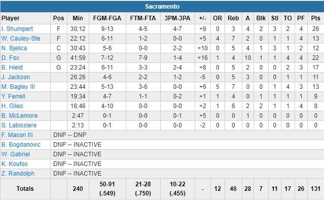 Iman Shumpert (26 points à 9/13, 3 rebonds, 4 passes, 2 contres, 3 interceptions), De’Aaron Fox (22 points à 7/12, 4 rebonds, 10 passes) et Buddy Hield (17 points à 6/11, 5 rebonds) ont montré la voie aux Kings, qui ont shooté à 54.9% pour aller chercher leur première win de la saison. En face Westbrook était épaulé par l’habituel Paul George (29 points à 10/18, 6 rebonds et 2 passes) et les 10 points et 14 rebonds de Steven Adams.