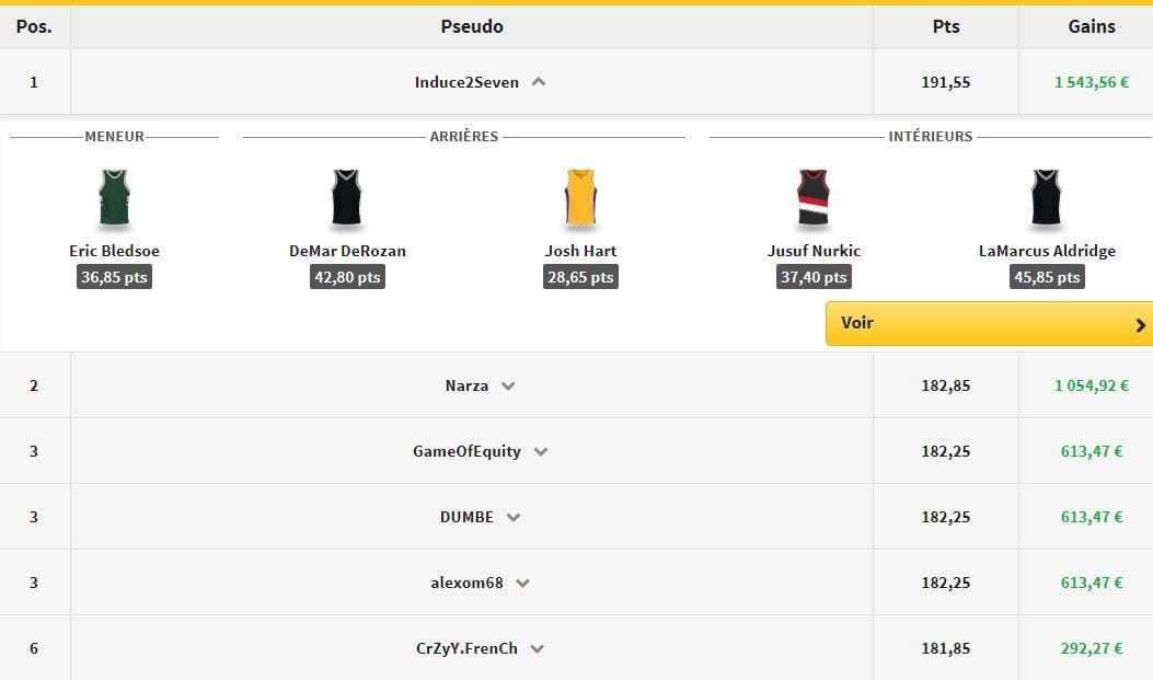 Le grand vainqueur du jour s’appelle Induce2Seven avec un 5 composé de Bledsoe, DeRozan, Hart, Nurkic et Aldridge. Il totalise 191,55 points points pour 1543,56€ de gains. Non loin derrière on retrouve Narza, 1054,92€ gagnés grâce à n cinq Bledsoe, DeRozan, LaVine, Aldridge et Powell, bravo à eux !
