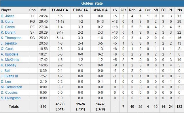 Tout simplement parce qu’aucune star des Warriors n’a dépassé les 30 minutes de jeu. Montée jusqu’à +30, l’équipe de Steve Kerr a logiquement levé le pied dans le dernier quart, après avoir successivement dominé les trois premiers 32-23, 38-24 et 36-34. Stephen Curry termine meilleur marqueur des siens avec 29 points à 11/18 (6/13 à 3-points), 4 rebonds et 8 passes, Kevin Durant suit avec 22 points à 9/17, 4 rebonds et 3 passes. On note aussi les 13 points, 5 rebonds et 3 passes de Jonas Jerebko en sortie de banc. La seule mauvaise nouvelle de la soirée concerne Klay Thompson, touché à la cheville et sorti après 25 minutes sur le parquet (16 points à 6/14, 3 rebonds et 4 passes).