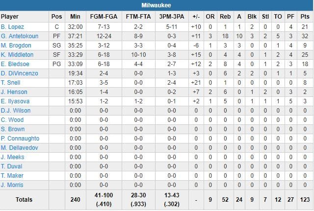Les 76ers étaient en visite à Milwaukee et ils sont repartis avec une petite fessée, 123-108, donnée par Giannis Antetokounmpo, énorme avec 32 points à 12/24, 18 rebonds, 10 passes et 3 contres, Khris Middleton (25 points à 6/18, 4 rebonds, 4 passes) et Brook Lopez (21 points à 7/13) pour permettre aux Bucks (49 points à 30 dans le 2ème quart !) de rester invaincus (4-0).