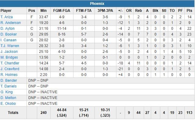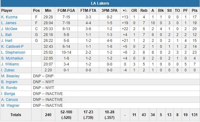 Devin Booker (23 points, 7 rebonds et 7 passes) a été contraint de sortir sur blessure (ischio) dans le 3ème quart-temps. Le n°1 de la draft Deandre Ayton a signé 22 points et 11 rebonds. Avant la leçon du 2ème quart, aucune de deux équipes n’avait réussi à prendre plus de 6 points d’avance dans le 1er quart, et les Suns n’avaient encore que 5 points de retard (46-41) après un layup d’Isaiah Canaan à 7’09 de la mi-temps. L.A. va ensuite provoqué 4 pertes de balles pour partir sur un 17-2 qui va permettre à l’équipe de s’envoler 63-43 sur un dunk de Josh Hart à 3’51 de la pause. À la mi-temps, les Lakers comptaient 22 points d’avance (76-54) et Phoenix n’est jamais parvenu à revenir à moins de 16 unités dans le 3ème quart.