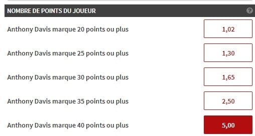 Aujourd’hui on va miser sur un des hommes en forme du moment : Anthony Davis. Il fait bien sûr un gros début de saison et ce soir face aux Nets, il devrait poser encore d’énormes soucis à la défense. Bien épaulé depuis le début de saison, on le voit en mode « je vous porte sur mes épaules » ce soir face à des Nets toujours coriaces. Il y a quelques jours on l’avait proposé pour le pari risqué et s’était passé à un point. Ce soir on va prendre un gros risque en espérant qu’il marque au moins 40 points.