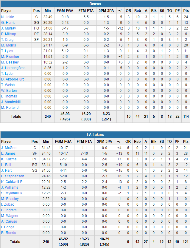 LeBron James a été le grand artisan de ce succès avec son tout premier triple-double sous le maillot purple & gold : 28 points à 10/17, 11 rebonds, 11 passes et 3 interceptions en 35 minutes. Il a reçu un soutien précieux de nombreux joueurs : JaVale McGee (21 points à 10/16 et 7 rebonds) mais aussi dans le money time de Lonzo Ball (12 points à 5/10), Kyle Kuzma (22 points à 8/18) et Lance Stephenson (12 points à 5/11). C’est ce dernier qui a mis le feu en dernier acte avec deux tirs à 3-pts coup sur coup pour ramener les Lakers, mal embarqués. Les Lakers shootent à 50% alors que Denver est à 49.5% mais avec un très mauvais 6/23 à 3-pts, en plus de 18 ballons perdus. Le trio Nikola Jokic (24 points à 9/18, 10 rebonds, 3 passes et 5 ballons perdus), Jamal Murray (22 points à 8/17) et Monte Morris (20 points à 6/9 et 6 passes) a porté Denver mais n’a pas réussi à faire la différence dans le money time