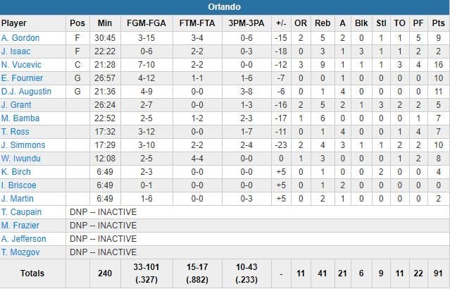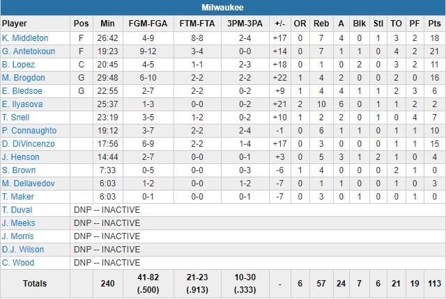 Khris Middleton (18 points à 4/9, 7 rebonds, 4 passes) et Malcolm Brogdon (16 points à 6/10) ont tenu la baraque face à Nikola Vucevic (16 points et 9 rebonds) et D.J. Augustin (11 points, tous en première mi-temps. Le Magic a été limité à 32% aux tirs et 23% à 3-points (10/43, plus grand nombre de tentatives dans l’histoire de la franchise sur un match).