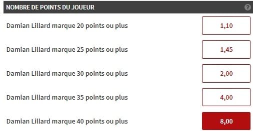 Aujourd’hui on vous propose de tenter votre chance sur une performance individuelle, celle d’un des hommes chauds de ces derniers jours : Damian Lillard. Le meneur est d’une grosse régularité en ce début de saison et reste sur deux énormes performances : 41 et 42 points ! Et s’il signait un 3ème match de suite à au moins 40 points ? Il en est capable même si ce sera compliqué à Indianapolis.