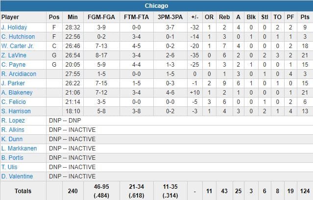 Côté Bulls, Zach LaVine et Antonio Blakeney ont signé 21 points chacun, Wendell Carter Jr.. 18. L’équipe est toujours privée de Lauri Markkanen, Kris Dunn, Bobby Portis et Denzel Valentine.