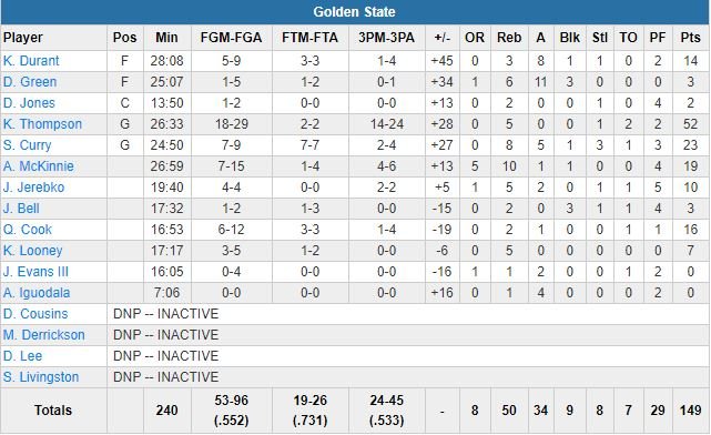 Thompson, 22 points dans le premier quart (6 tirs à 3-points) et 36 à la mi-temps (mi-temps où les Warriors, désormais à 7-1, menaient 92-50 ! Avec un 10/14 pour le Splash Brother, soit un record égalé sur une mi-temps, détenu jusque là seul par Chandler Parsons), bat donc le record NBA de 3-points dans un match en faisant mieux que son coéquipier Stephen Curry (13 en 2016). Un record établi à un peu moins de 5 minutes de la fin du troisième quart, son équipe devant 113-69. Dans ce match Curry a terminé à 23 points, Kevin Durant 14 points et 8 passes et Alfonzo McKinnie 19 points et 10 rebonds.