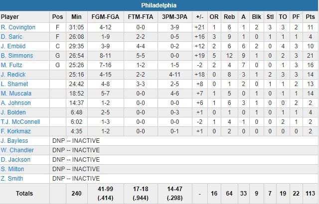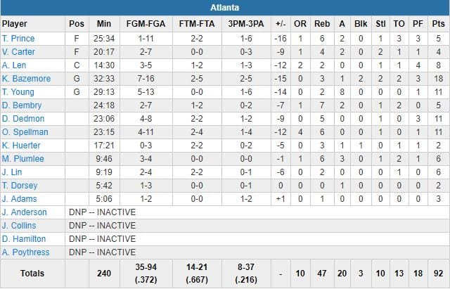 À noter : Philadelphie (7 joueurs à au moins 10 points) a dominé le rebond 64-47. Les Hawks, 37% sur la soirée, n’ont réussi que trois tirs à 3-points