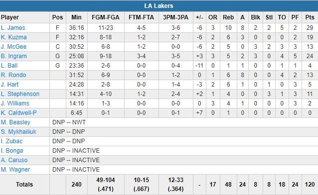 La star des Lakers (2-5) a marqué 10 de ses 29 points dans le quatrième après avoir manqué ses 5 premiers shoots de la soirée, Brandon Ingram (24 points à 9/18, 5 rebonds et 3 contres) était de retour de suspension, Kyle Kuzma n’a marqué que 8 points sur le reste de la soirée après avoir commencé avec 11 points sur les 5 premières minutes de jeu. L’équipe, 18 ballons perdus, a laissé Minnesota prendre 18 rebonds offensifs (record en saison).