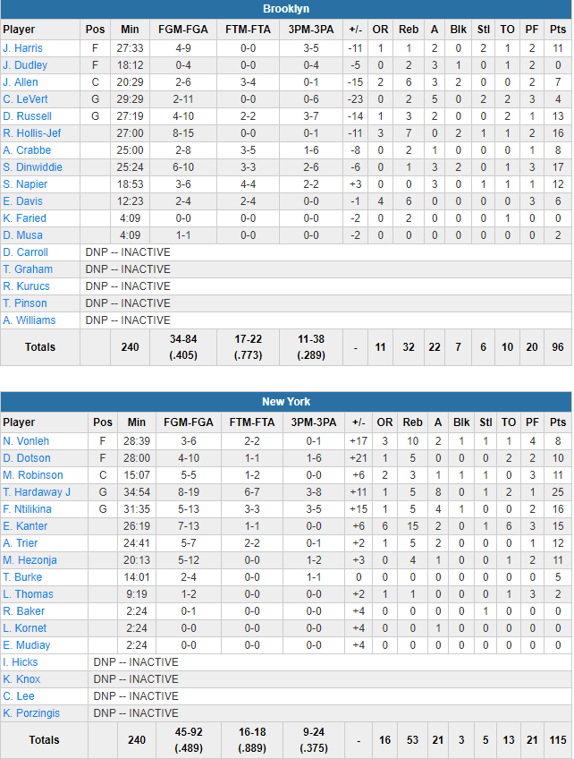Une nouvelle fois ce nouveau 5 a bien fonctionné pour les Knicks, mené par un excellent Tim Hardaway Jr., pas vraiment perturbé par le visage en sang en première mi-temps. Il signe 25 points à 8/19 et égale son record en carrière avec 8 passes décisives. Il a été bien aidé par un Frank Ntilikina encore une fois agressif et qui termine avec 16 points à 5/13, 5 rebonds, 4 passes et 1 contre. Enes Kanter sort du banc pour apporter 15 points et 15 rebonds. Les Knicks shootent à 48.9% et captent en plus 16 rebonds offensifs contre un petit 40.5% aux Nets. En back-to-back, ces derniers n’ont tenu qu’un quart, avec un 5 majeur peu performant à l’image des 13 points à 4/10 de D’Angelo Russell et des 4 points à 2/11 de Caris LeVert. Les bons matchs de Spencer Dinwiddie (17 points) et Rondae Hollis Jefferson (16 points et 7 rebonds), n’ont pas suffi