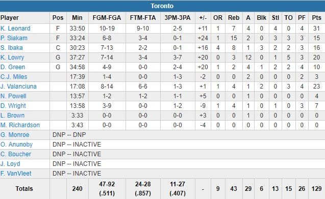 À ses côtés Pascal Siakam ajoute 15 points plus un record en carrière de 15 rebonds, Kyle Lowry 20 points et 13 passes (plus longue série de matchs à au moins 10 passes en carrière avec 6), Jonas Valanciunas bat son record en saison avec 23 points (en seulement 17 minutes) et Serge Ibaka signe 16 points dans cette 6ème victoire consécutive à domicile pour commencer la saison (record de franchise). Les Sixers n’avaient encore jamais perdu autant de ballons cette saison (23, 13 interceptions pour les Raptors).
