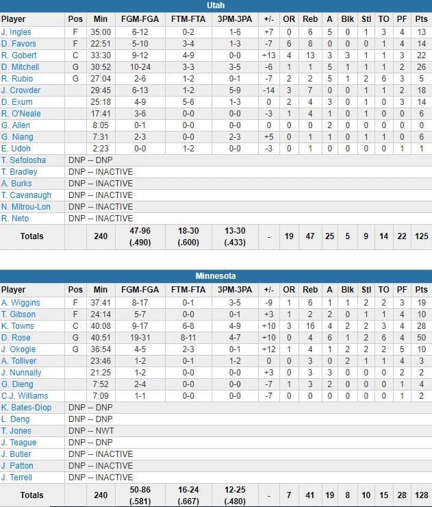 À noter : Rose a marqué 19 de ses 50 points dans le 3ème quart, période durant laquelle les Wolves ont pris 5 points d’avance avant de jouer les 12 dernières minutes. Karl-Anthony Towns a signé 9 de ses 28 points dans la période. Donovan Mitchell a terminé à 26 points (10/24, 5 passes) pour Utah (il n’a pas joué les dernières 4’22 en raison de douleurs aux ischio-jambiers), Rudy Gobert 22 (9/12, 13 rebonds, 3 passes, 3 contres), Crowder 18 en sortie de banc. Après 11 tentatives sur les 3 premiers quarts, Utah a shooté à 13/19 aux lancers dans le 4ème. Andrew Wiggins était de retour après 4 matchs d’absence (quadriceps), il a signé 19 points à 8/17.