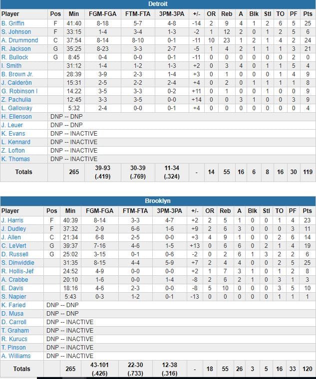 Autour de lui Joe Harris a ajouté 23 points (record en saison), Caris LeVert et Jarrett Allen 19 chacun et Brooklyn met fin à une série de 3 victoires pour un bilan désormais porté à 3-5. Pour Detroit, porté par les 25 points (8/18, 9 rebonds, 4 passes, 6 ballons perdus) de Blake Griffin, les 24 points (8/14, 8/10 aux lancers-francs) et 23 rebonds d’Andre Drummond et les 21 points de Reggie Jackson, c’est une 3ème défaite d’affilée (4-3)