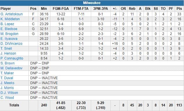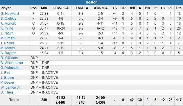 Kyrie Irving a mené la danse avec 28 points (10/20, 3 rebonds, 7 passes) dont 6 tirs à 3-points, Al Horford 18 et 4 tirs de loin, Marcus Morris 17 et 5 réussites derrière la ligne. Boston était devant 55-53 à la pause suite à deux tirs primés consécutifs d’Irving en fin de 2ème. Le meneur a ensuite démarré le 3ème avec un 3/3 de loin et l’équipe menait 93-78 avant les 12 dernières minutes. De retour après avoir passé le protocole commotion, Giannis Antetokounmpo a terminé à 33 points à 7/11 (0/1 à 3-points), 11 rebonds et 2 passes, Khris Middleton et Malcolm Brogdon apportent 16 points.