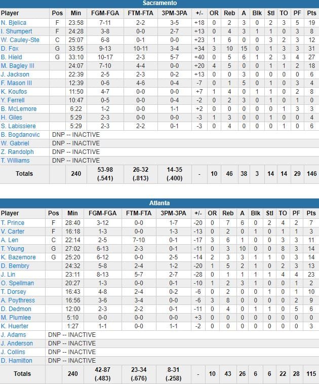 Avant ce match, les records en carrière de Fox étaient de 26 points, 9 rebonds et 10 passes. Buddy Hield n’était pas mal non plus avec 27 points (10/17), 5 rebonds et 6 passes et Nemanja Bjelica a signé 19 points à 7/11 et 3 passes. Devant de 5 points à la mi-temps, les Kings (31 points inscrits minimum sur chaque quart-temps) ont passé un 46-23 à leurs adversaires dans le 3ème, Fox a inscrit 23 points dans la période. En tête 115-87 alors que le dernier quart n’était même pas entamé, l’équipe au style up-tempo a mis la pression jusqu’au bout et Fox, Hield et les autres titulaires ne sont pas sortis avant les dernières minutes de la rencontre.