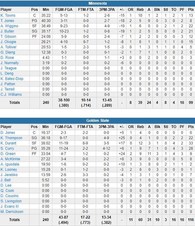 Les Warriors accueillaient Minnesota cette nuit à Oakland et l’équipe bien qu’ayant entretenu un peu le suspense avant la mi-temps et en prenant au pire 2 points de retard à plusieurs reprises entre la fin du 3ème et le début du 4ème quart-temps, s’est imposée largement 116-99. Il faut dire que les 12 dernières minutes ont été brutales pour les Wolves avec un 33-12 encaissé.
