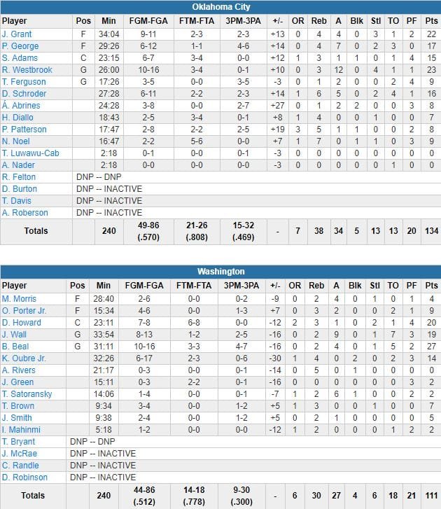 Russell Westbrook a terminé à 23 points à 10/16 et 12 passes, Jerami Grant 22 points à 9/11, 4 rebonds et 4 passes, Dennis Schröder 16 points à 6/11, 6 rebonds et 5 passes et Paul George 17 points à 6/12, 4 rebonds et 7 passes. En plein deuxième match de back-to-back et malgré le retour de Dwight Howard (20 points à 7/8, 3 rebonds) pour Washington, le Thunder, 109 points par match cette saison avant cette rencontre et devant 79-50 à la pause, comptait déjà 110 points après trois quarts-temps.