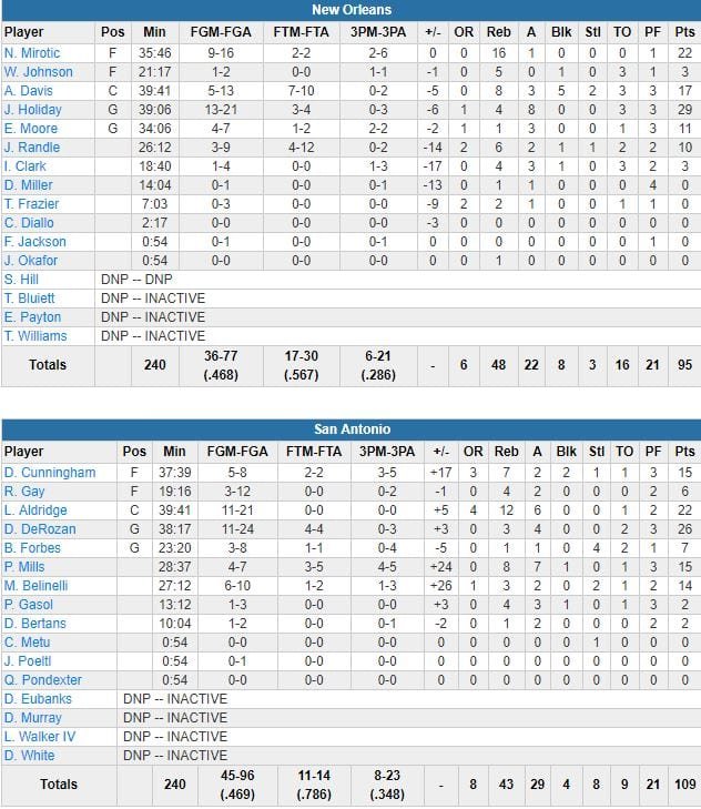 À noter : les Pelicans (6/21 à 3-points) ont perdu 16 ballons et n’ont shooté qu’à 16/30 aux lancers-francs. Dante Cunningham a signé 15 points, Patty Mills 15 aussi, en plus de 7 rebonds et 7 passes. Jrue Holiday a terminé meilleur marqueur des Pelicans avec 29 points (13/21, 8 passes). Nikola Mirotic a signé 22 points à 9/16 et 16 rebonds.