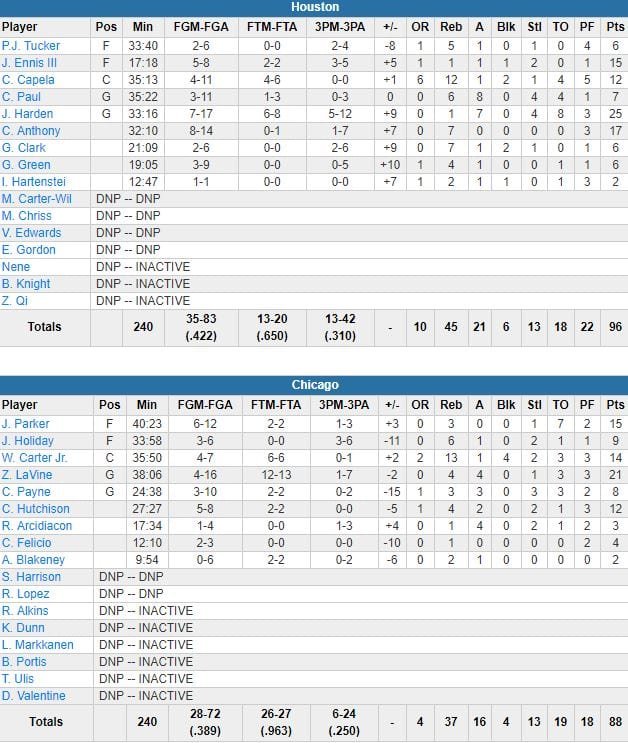 À noter : Carmelo Anthony a terminé à 17 points, James Ennis 15 en 17 minutes. Aucune des deux équipes n’a mené de plus de 5 points en 1ère mi-temps. Zach LaVine a signé 21 points, Wendell Carter Jr. 14 points et 13 rebonds et Jabari Parker 15 points. Harden n’a pas marqué avant un layup à 3’55 de la fin du 2ème quart. Eric Gordon (adducteur) n’a pas joué.