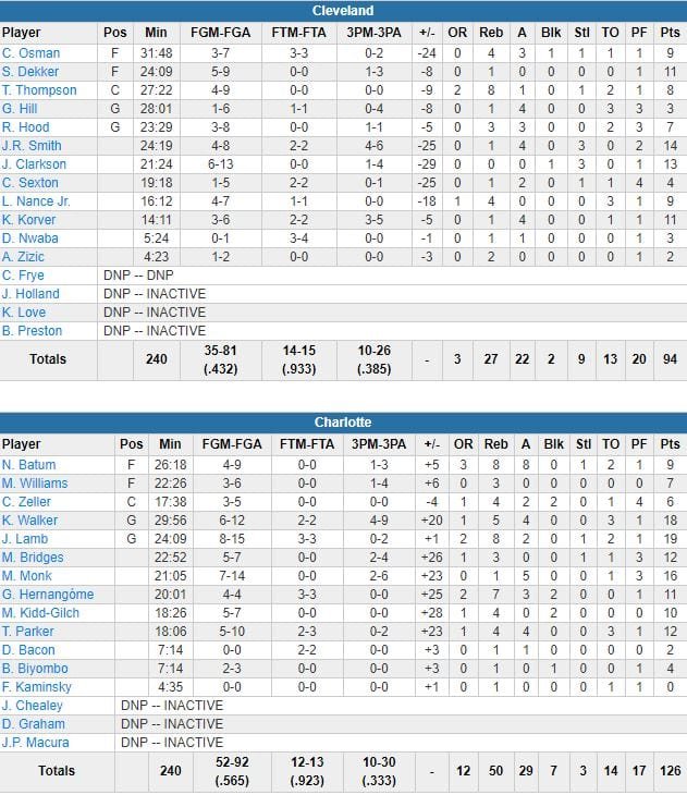 Charlotte Hornets – Cleveland Cavaliers 126-94