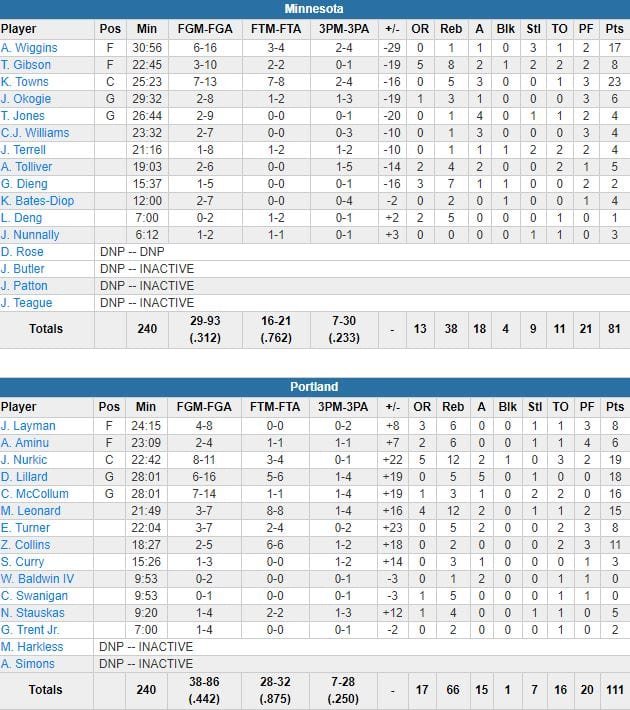 À noter : Damian Lillard a terminé meilleur marqueur de Portland (66 rebonds à 38) avec 18 points à 6/16, 5 rebonds, 5 passes, devant C.J. McCollum et ses 16 points à 7/14. Les Blazers ont dominé le 2ème et 3ème quart 31-18 et 31-19. Andrew Wiggins (17 points) a été le seul joueur de Minnesota (31.2% aux tirs) avec Towns à passer la barre des 10 points.