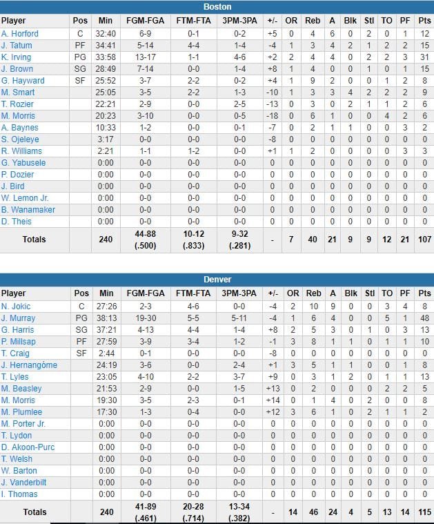 Denver est toujours invaincu à la maison (6-0) ! L’équipe recevait Boston cette nuit et a remporté une 9ème victoire en 10 matchs 115-107 avec un Jamal Murray en mode record en carrière : 48 points dont 19 dans le dernier quart à 19/30, 6 rebonds et 4 passes. Le meneur de 21 ans, 23 points en 1ère mi-temps, a permis aux siens de remonter un retard de 15 points dans le 1er quart.