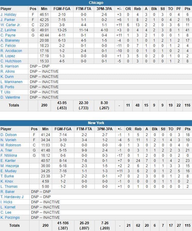 À noter : Antonio Blakeney a terminé à 17 points, Jabari Parker 15, Wendell Carter Jr. 11 points et 13 rebonds. Frank Ntilikina a joué 16 minutes pour 0 point à 0/6 et 2 passes. Tim Hardaway Jr. (dos) n’a pas joué, Trier l’a remplacé dans le cinq. Kevin Knox était de retour après 7 matchs manqués et a joué 5 minutes pour 2 points.