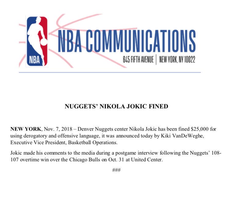 La NBA vient d’annoncer des sanctions à l’encontre de Nikola Jokic. L’intérieur des Nuggets va devoir payer 25 000$ d’amende pour des « paroles désobligeantes et offensantes » après la rencontre face aux Chicago Bulls. En évoquant Wendell Carter Jr. et le fait qu’il était grand et longiligne, il a lâché un « no homo » qui n’a logiquement pas du tout plus à la ligue.