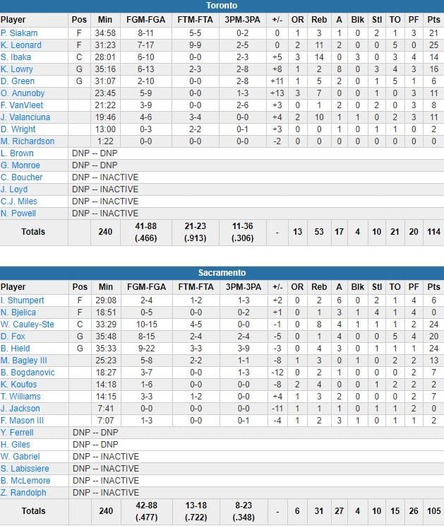 À noter : Toronto a dominé le rebond 53-31. Willie Cauley-Stein et Buddy Hield ont chacun inscrit 24 points pour Sacramento, De’Aaron Fox 20. Bogdan Bogdanovic a joué son premier match de la saison (il avait été opéré du genou gauche avant le début de saison). Il a joué 18 minutes pour 7 points à 3/6.