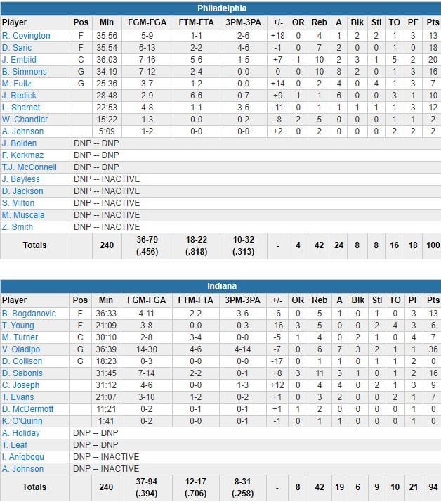Revenu à 29-23 après 12 minutes, Indiana a usé d’un 18-3 dans le 2ème quart pour passer devant 41-36. Les deux équipes se sont quittés sur un score égal à la mi-temps, 50-50. Les 76ers ont repris 5 points d’avance en début de 3ème, Robert Covington a inscrit 8 des 10 derniers points de la période et son équipe a pris 7 points d’avance au terme de cette dernière, 78-71.