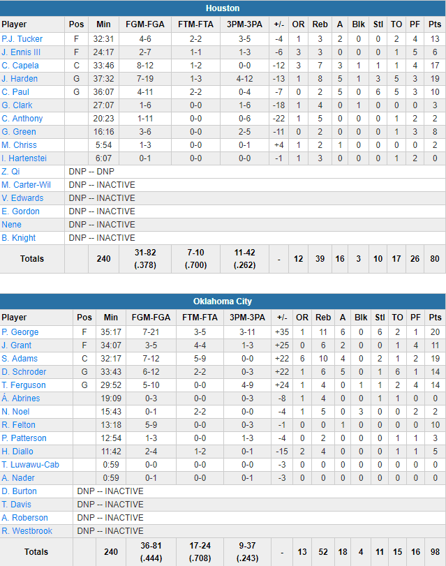OKC a construit son succès sur sa défense en limitant les Texans à 38% et en provoquant 17 ballons perdus, avec pas moins de 6 interceptions pour Paul George. Ce dernier signe 20 points à 7/21, 11 rebonds et 6 passes. Steven Adams est précieux à l’intérieur avec 19 points et 10 rebonds tandis que Dennis Schröder et Terrance Ferguson ajoutent 14 points chacun. OKC n’était pas non plus en grande réussite avec 44.4% aux tirs dont un 9-37 mais la défense a fait le job. En face James Harden est limité à 19 points à 7/19, 8 rebonds, 5 passes et 5 ballons perdus, Chris Paul à 10 points à 4/11, 6 passes et 5 ballons perdus, et Carmelo Anthony à 2 points à 1/11. Seul Clint Capela fait le boulot avec 17 points à 8/12. L’équipe n’a rentré que 11 de ses 42 tentatives de loin et pour la 5ème fois de la saison ils n’ont pas atteint les 100 points.