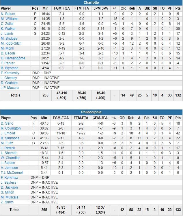 À noter : Nicolas Batum a joué 16 minutes pour 5 points à 2/4, 2 rebonds et 2 passes. Quatre joueurs du banc dépassent les 10 points pour Charlotte. Dario Saric a terminé à 18 points à 6/13 et 9 rebonds pour Philadelphie.