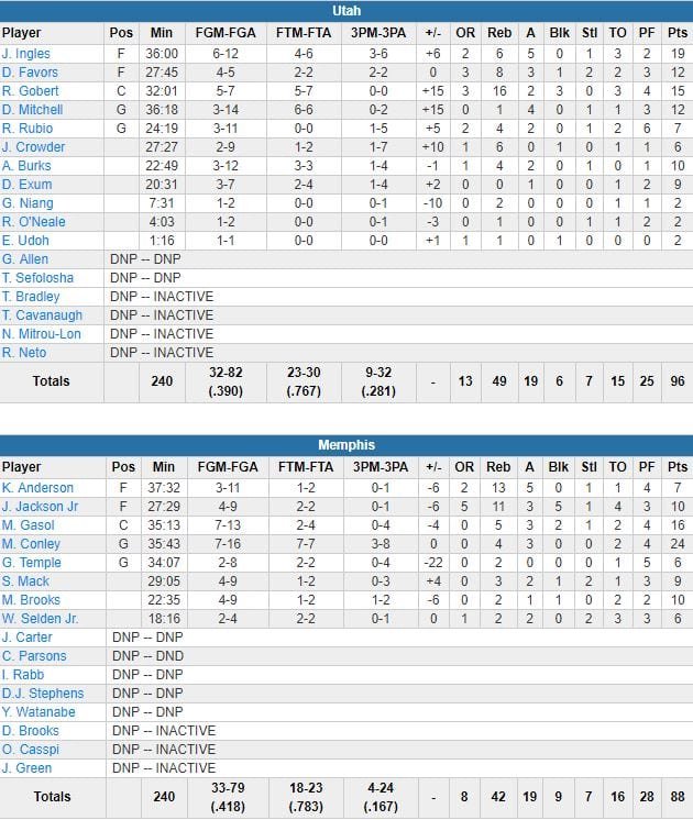 C’est dans les 6 dernières minutes que l’équipe a fait la différence avec un 14-5 durant lequel Gobert a marqué 8 points et où l’écart est monté jusqu’à 11 unités. Derrick Favors (4/5, 8 rebonds) et Donovan Mitchell (3/14, 4 passes) terminent à 12 points chacun. Memphis perd son premier match à domicile de la saison malgré 24 points (7/16, 4 rebonds, 3 passes) de Mike Conley, 16 (7/13, 5 rebonds, 3 passes, 2 contres) de Marc Gasol ou encore 10 points et 11 rebonds de Jaren Jackson Jr..