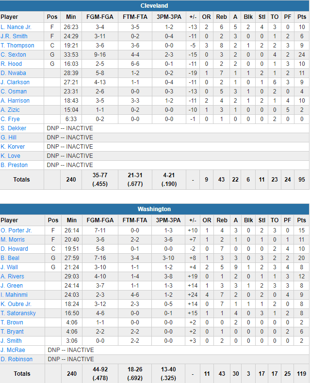 Ca va mieux pour les Wizards, qui s’imposent pour la 3ème fois de suite en corrigeant les Cavaliers 119-95 das une rencontre où à la pause la messe était dite puisqu’ils menaient au score 73-52. Ils se sont appuyés sur leur collectif avec pas moins de 30 passes décisives et 10 joueurs à au moins 8 points. Bradley Beal signe 20 points à 7/16 et Otto Porter Jr. 15 points. John Wall n’a même pas eu à briller et signe seulement 8 points à 3/10 et 9 passes en 21 minutes. En face le rookie Collin Sexton s’est bien battu avec 24 points à 9/15, mais aucun autre Cav ne marque plus de 11 points. L’équipe est notamment limitée à 4/21 à 3-pts en plus de perdre 23 ballons.