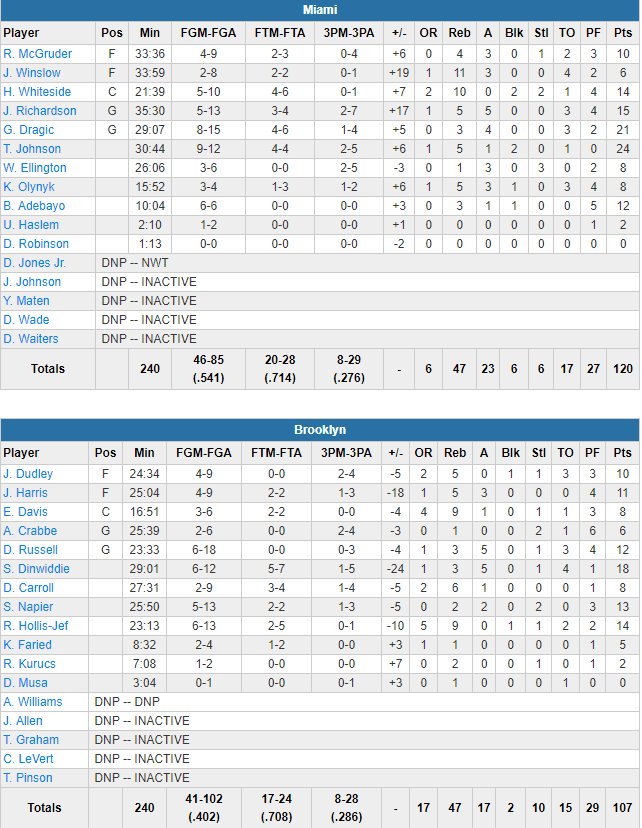 Fin de série pour Miami ! Après 3 défaites consécutives, l’équipe s’est repris en dominant Brooklyn cette nuit. Dans le sillage de Tyler Johnson (24 points à 9/12, record en saison), Goran Dragic (21 points à 8/15) et Hassan Whiteside (14 points et 10 rebonds), le Heat a fait la course en tête tout le match et pris jusqu’à 23 points d’avance face à des Nets (3ème défaite d’affilée) limités à 35% sur les 3 premiers quarts (90-72) et privés de Caris LeVert et Jarrett Allen. D’Angelo Russelllimité à 12 points à 6/18, Spencer Dinwiddie a signé 18 points à 6/12 en sortie de banc.