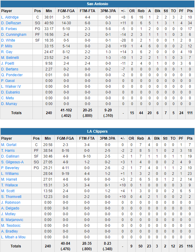 Les Clippers ont été menés par Lou Williams, auteur de 23 points à 9/20 et surtout un panier à 3-pts clutch dans la dernière minute. Il a été bien aidé par les 19 points et 6 rebonds de Danilo Gallinari, les 18 points, 8 rebonds et 5 passes de Tobias Harris, et les 14 points, 6 rebonds et 5 passes de Montrezl Harrell. Les Clippers ont été bien plus en réussite que leur adversaire avec 47.1% aux tirs contre seulement 39.8% aux Spurs. LaMarcus Aldridge a encore vécu une sale soirée, bien parti en premier acte, il a ensuite enchaîné les échecs et termine avec 10 points à 3/15, mais tout de même 16 rebonds. DeMar DeRozan a surnagé avec 34 points à 14/30, 6 rebonds, 5 passes et 3 interceptions, bien aidé par Bryn Forbes (17 points à 5/8 à 3-pts) et Rudy Gay (19 points à 8/12), mais les Spurs ont payé leur maladresse malgré seulement 5 ballons perdus et 15 rebonds offensifs.