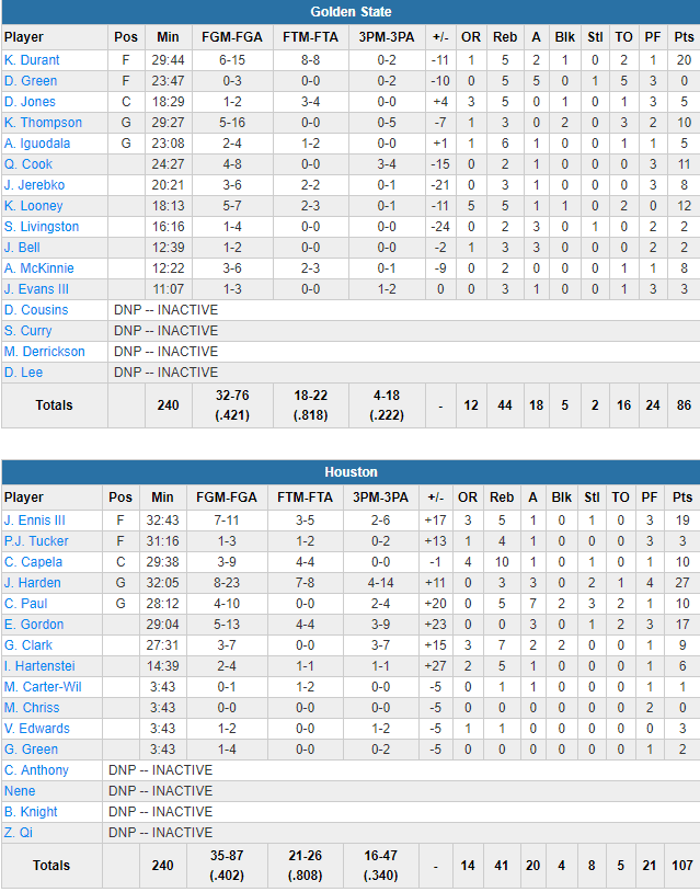 James Harden a mené la danse pour les Texans malgré sa maladresse avec 27 points à 8/23 dont 4/14 à 3-pts. Eric Gordon a enfin retrouvé un peu d’adresse et signe 17 points à 5/13 en sortir de banc. James Ennis sort encore un bon match avec 19 points à 7/11 et 5 rebonds alors que Chris Paul et Clint Capela ajoute 10 points chacun. Houston shoote à seulement 40.2% mais avec un 16/47 à 3-pts ,prend 14 rebonds offensifs et perd seulement 5 ballons. En face les Warriors ont vécu une sale soirée, peut-être pas remis des événements des derniers jours. Ils inscrivent seulement 86 points à 42.1% dont un terrible 4/18 à 3-pts et seulement 18 passes pour 16 ballons perdus. Kevin Durant (20 points à 6/15 et 5 rebonds) et Klay Thompson (10 points à 5/16) ont vécu une soirée compliquée et dans ses conditions difficile pour les champions de s’imposer. Draymond Green finit sans le moindre point et 5 ballons perdus et 5 passes. Le banc n’a pas suffi avec 12 points pour Kevon Looney et 11 pour Quinn Cook.