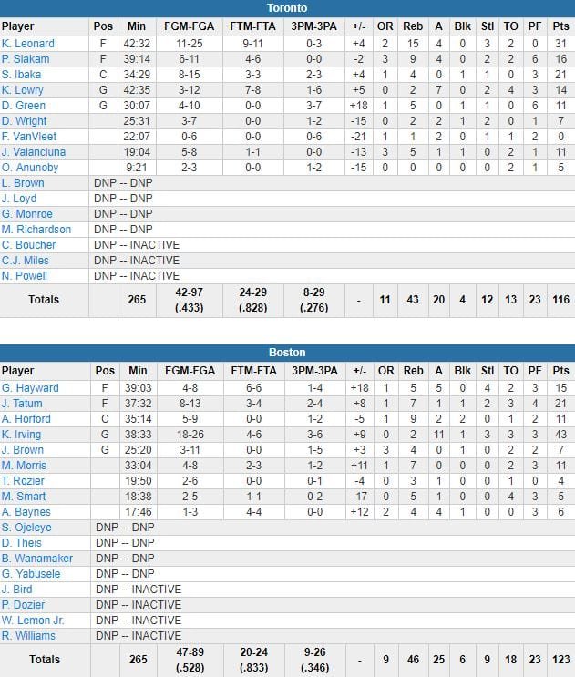 Hayward a rentré deux nouveaux lancers clutchs en début de prolongation, Ibaka a répondu avec un tir à 2-points puis Hayward a scoré sur un service d’Irving, qui évitera quelques instants plus tard à Tatum de perdre le ballon avant d’inscrire un layup pour le +4, 113-109. Toronto (3ème défaite consécutive) ne reviendra à partir de là pas en-dessous des 3 points de retard.