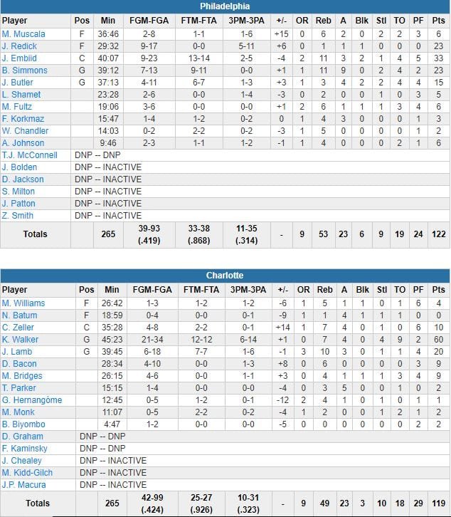 Joel Embiid et Ben Simmons ont également sorti de très gros matchs avec respectivement 33 points (9/23, 13/14 aux lancers-francs) et 11 rebonds et 23 points (7/13, 9/11 aux lancers-francs), 11 rebonds et 9 passes. C’est la 3ème fois que Philadelphie, également aidé par les 23 points dont deux jump shots importants en prolongation de J.J. Redick, bat Charlotte cette saison.