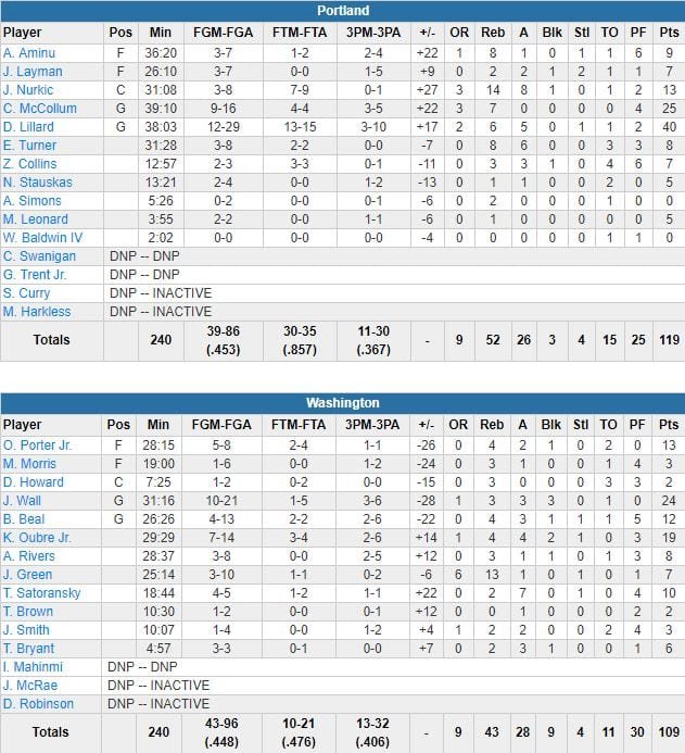L’équipe de Terry Stotts a démarré son match sur un 7/9 à 3-points et a pris les devants 32-12 à 3’54 de la fin du 1er quart. Washington (dominé 52-43 au rebond) a sévèrement réagi avec un 15-0 pour revenir à 32-27 mais va ensuite encaisser un 30-14 pour se retrouver mené 62-41 à la mi-temps. Lillard a planté 13 points dans le 2ème quart puis 18 dans le 3ème.
