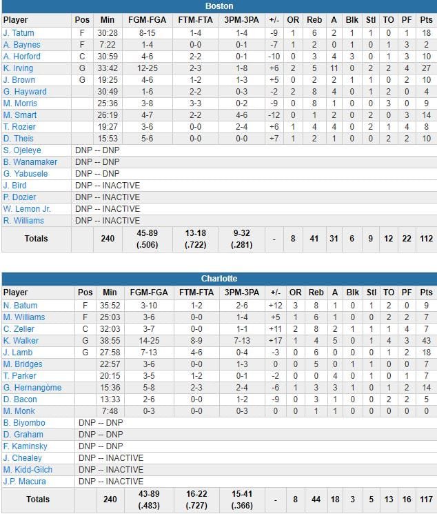 À noter : Nicolas Batum a terminé à 9 points à 3/10 et 8 rebonds en 35 minutes. Malik Monk a raté ses 16 dernières tentatives à 3-points. Aron Baynes (2 points à 1/4 et 2 rebonds en 7 minutes) était titulaire à la place de Gordon Hayward (4 points à 1/6, 8 rebonds, 4 passes) pour Boston.