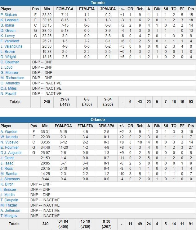 Evan Fournier, 27 points (11/20, 3 rebonds, 4 passes) dont 22 en seconde mi-temps, avait égalisé sur un dunk à 2.3 secondes du buzzer. Kyle Lowry (9 points à 3/9, 4 rebonds, 7 passes) s’est chargé de la remise en jeu derrière et a trouvé Green, parti à gauche avant de rentrer son tir assassin, laissant 0.5 seconde au compteur. Nikola Vucevic (14 points à 6/12, 18 rebond, 4 passes) a raté un shoot à plus de 20 mètres au buzzer. Kawhi Leonard a terminé meilleur marqueur de Toronto avec 18 points (8/16, 6 rebonds, 2 passes). Moins en galère qu’Orlando en attaque, Toronto a pris jusqu’à 18 points d’avance en 1ère mi-temps et menait 40-22 au milieu du 2ème pendant que le Magic avait la tête sous l’eau, sous les 30% de réussite aux tirs.