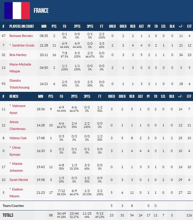 Endy Miyem termine avec 17 points et 11 rebonds, Bria Hartley ajoute 16 points et 5 passes et Sandrine Gruda et Marine Johannes marquent 11 points chacune. L’équipe shoote à 11/25 derrière l’arc.