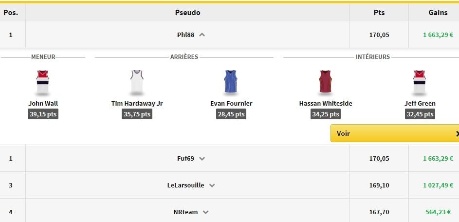Phl88 et Fuf69 sont les grands vainqueurs du jour avec le cinq suivant : Wall, Fournier, Hardaway Jr. Green et Whiteside. Ils totalisent 170.05 points fantasy, pour 1 663,29 € de gains !