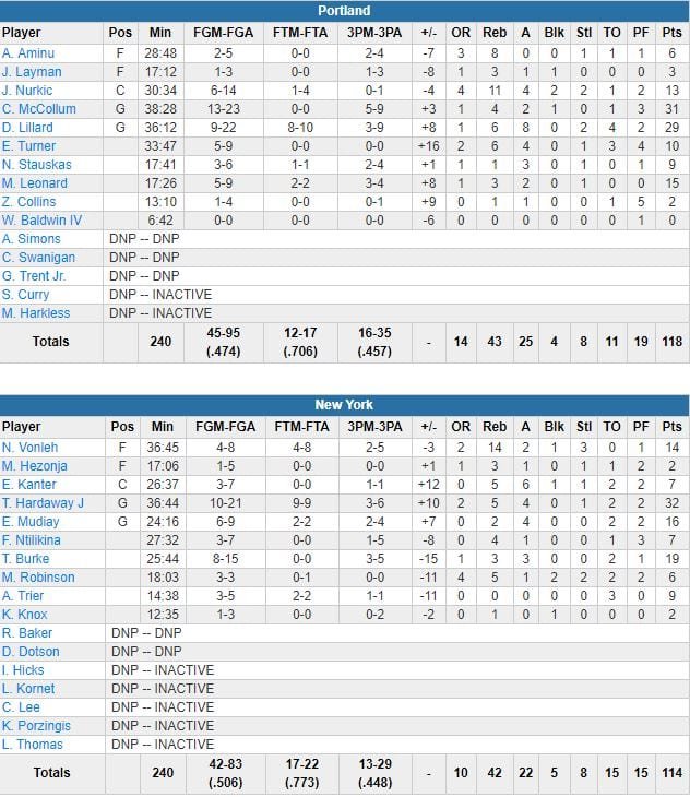 C.J. McCollum a terminé meilleur marqueur des Trail Blazers avec 31 points (13/23, 5/9 à 3-points), Damian Lillard a aligné 29 points (9/22), 6 rebonds et 8 passes et Jusuf Nurkic 13 points à 6/14, 11 rebonds et 4 passes. Le match a été serré bien que longtemps dominé au score par les Knicks, qui ont payé leur coup de mou dans le 3ème quart (31-25 encaissé).